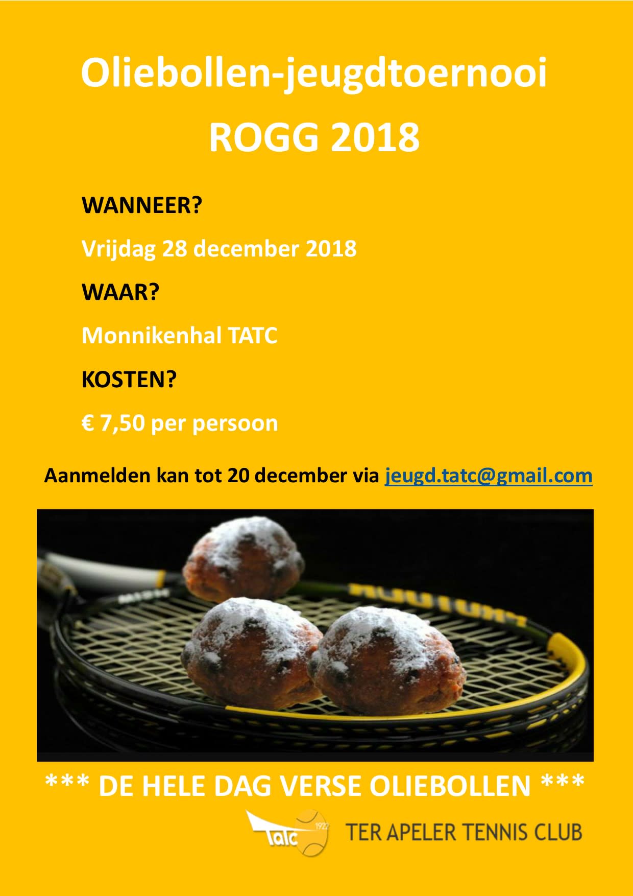 Ook dit jaar organiseert de jeugdcommissie van TATC wederom het oliebollen-jeugdtoernooi. Het toernooi voor jeugdleden t/m 17 jaar vindt op vrijdag 28 december 2018 plaats in de Monnikenhal van TATC aan de Havenstraat 2 in Ter Apel. Met verschillende tennisverenigingen uit de omgeving maken we er ook dit jaar weer een leuke, gezellige tennisdag van. In de week vooraf het toernooi zullen poules naar leeftijd en zoveel mogelijk naar speelsterkte ingedeeld worden. De deelnemers zullen per e-mail bericht ontvangen over hun speelschema, zodat iedereen weet hoe laat per poule (dubbelsituatie) wordt gestart. De hele dag worden verse oliebollen gebakken en uiteraard ook gegeten:). Voor deelname aan het toernooi wordt per deelnemer een kleine bijdrage van € 7,50 gevraagd. Opgave kan door middel van: naam, j/m, leeftijd, kleur ballen en speelveld: rood (klein veld), oranje (driekwart veld), groen (groot veld) of groot veld met gele ballen. Vergeet niet het e-mailadres door te geven aan ons, want je ontvangt de aanvangstijd per mail. Aanmelden kan tot 20 december via